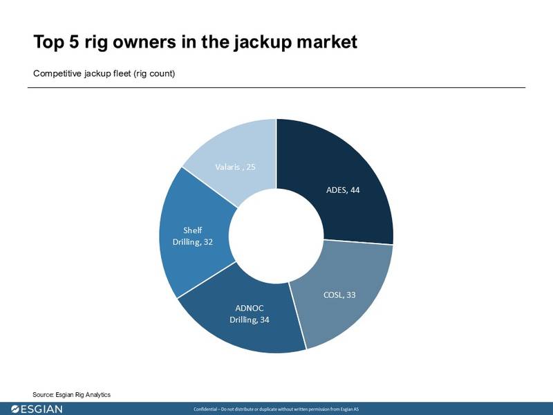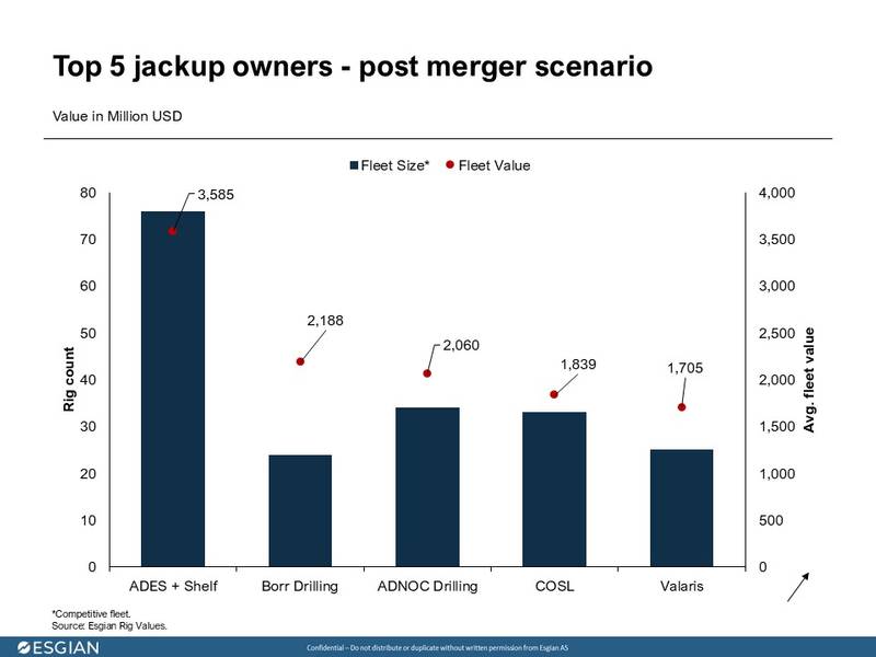 A nova entidade terá uma frota competitiva combinada de 76 plataformas autoelevatórias* (a Trident XII está atualmente à venda para fins não relacionados à perfuração e, portanto, é considerada não competitiva pela Esgian). Isso elevará o valor de sua frota para US$ 3,4 bilhões a US$ 3,77 bilhões. A segunda maior empresa, a ADNOC Drilling, detém uma frota avaliada em US$ 1,96 bilhões a US$ 2,16 bilhões, 42% menor.