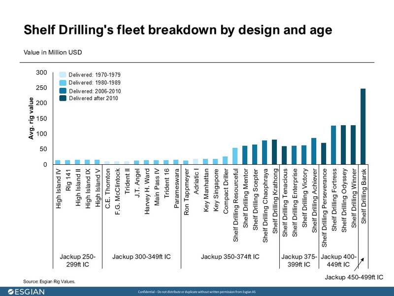 Essa mudança estratégica aumentou a avaliação de sua frota para US$ 1,42 a US$ 1,57 bilhão, com plataformas mais antigas avaliadas entre US$ 7 e US$ 11 milhões, plataformas mais novas avaliadas entre US$ 55 e US$ 65 milhões, e a Shelf Drilling Barsk, para ambientes adversos, sendo a plataforma autoelevatória de maior valor da frota, entre US$ 235 e US$ 259 milhões.